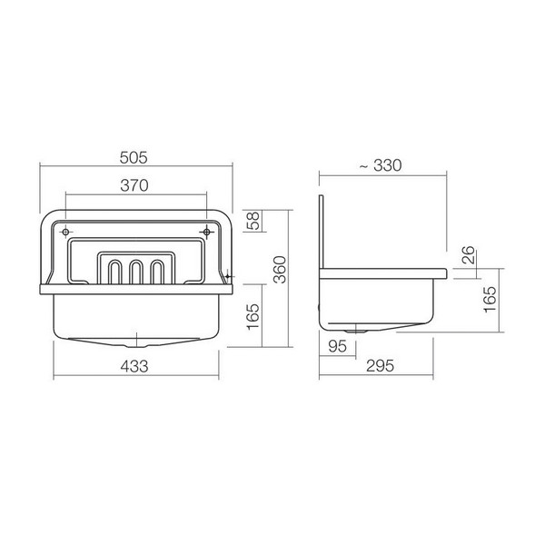 Fali kiöntő 505x330mm Zománcozott acéllemez fali kiöntő csaplyuk nélkül, fehér színben, szürke műanyag peremmel, 6/4"-os leeresztőszeleppel, dugóval és lánccal. Opcióként rendelhető: cső- vagy búraszifon