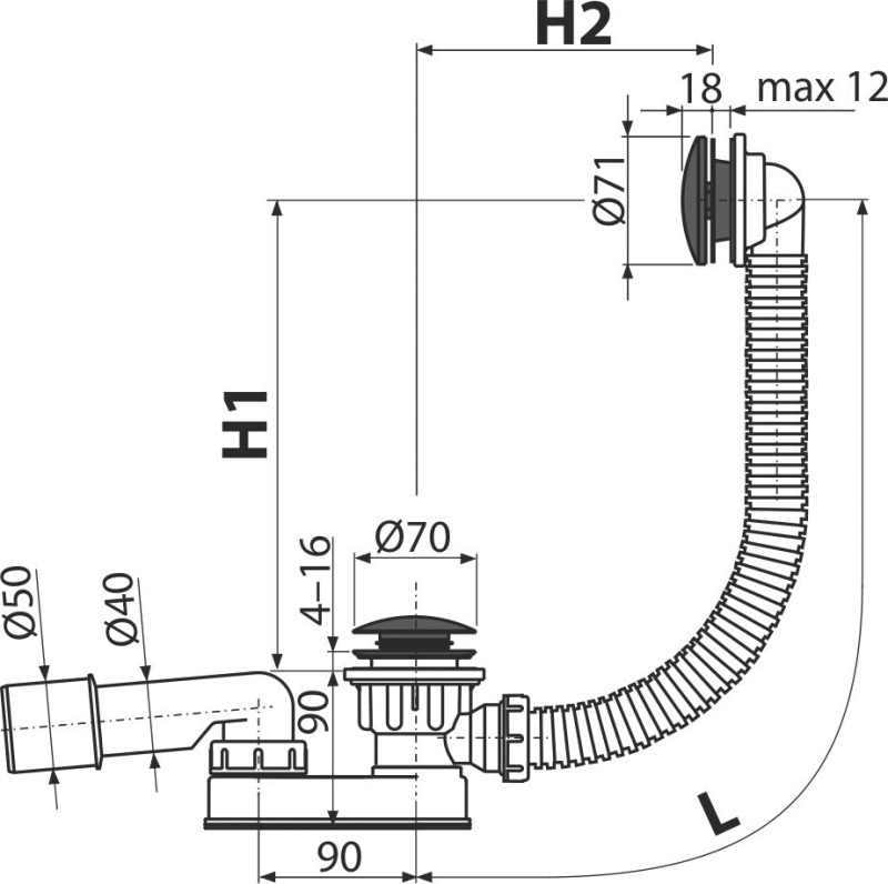 ALCA (Alcaplast) A509CKM-120 CLICK/CLACK kádszifon, feltöltős túlfolyóval vastag falú kádakhoz, króm