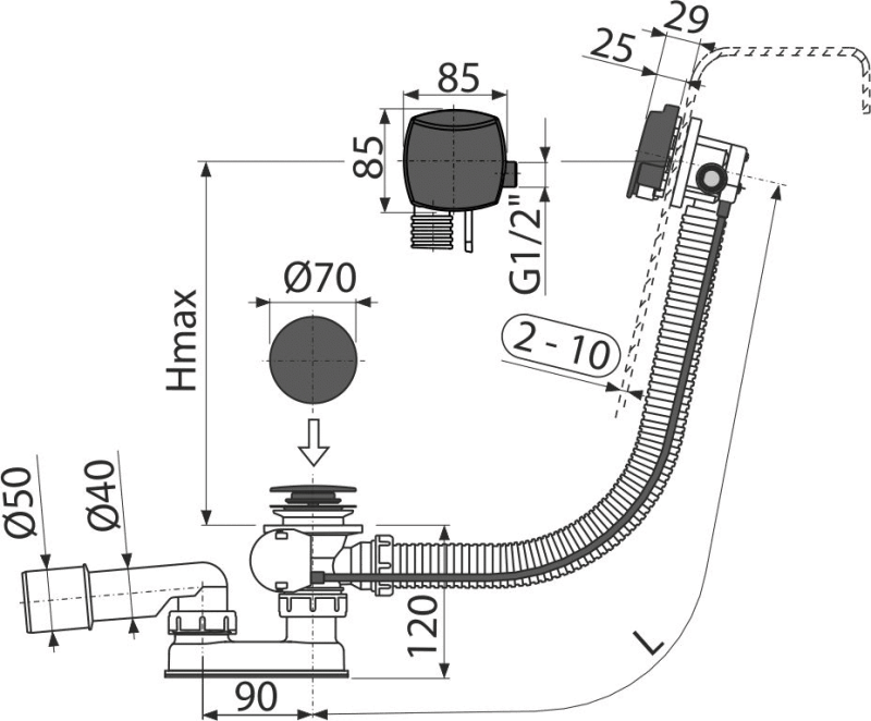 ALCA (Alcaplast) A55K-GM-P automata kádszifon készlet, GUN METAL-fényes