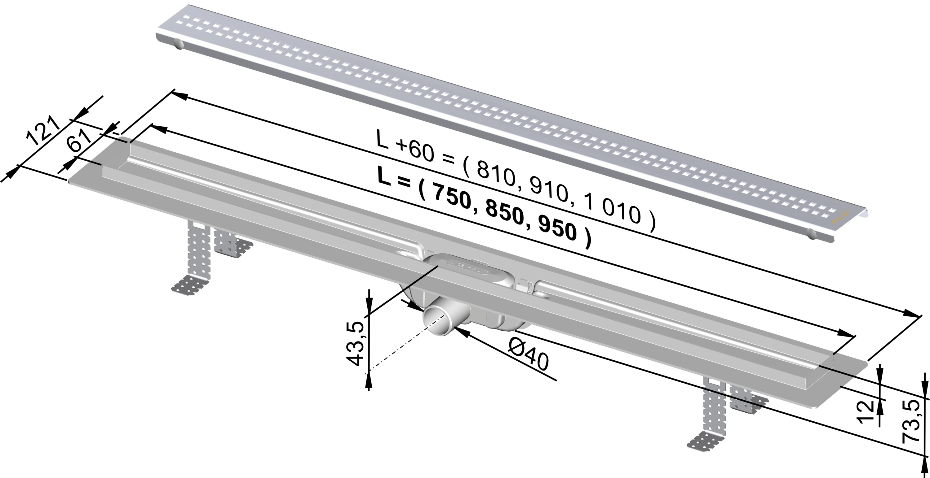 Alcaplast APZ9/Simple műanyag zuhanyfolyóka fém szita ráccsal. magasság: 6,2 cm, kombinált bűzzár, rács szélesség 6 cm. minimális aljzatbeton vastagság: 62 mm teljes szerkezeti magasság: 75 mm a zuhanyfolyóka szélessége: 60 mm a zuhanyfolyókák átfolyása (ČSN EN 1253): 30 l/perc. szennyvízelvezető cső: Ø40 terhelési osztály (ČSN EN 1253): K3 anyaga – a folyóka ház PP anyaga – bűzelzáró PP alacsony szerkezeti magasság 6,2cm-alkalmas az átépítéseknél egyszerű tisztítás a szenycsatornáig (Ø40mm) magas vegyi ellenáló képesség biztonságos vízszigetelési csatlakozás kombinált bűzelzáro (salyát fejlesztés) három hosszúság (750, 850, 950 mm) átfolyás 30 l/perc Anyag: Magassan elenáló műanyag,amei ellenál a fagynak,vegyszereknek és mechanikai hatásoknak. Szifon: Teljessen szétszedhető és könnyen tisztítható | 2 kamrás | kombinált bűzelzáró száraz | záró a szifon kiszáradás esetén. Csomagolás tartama: folyóka rács minőséges rozsdamentes acél szigetelő szallag kombinált bűzelzáró 2 kamrás rögzítő kellekek (csavarok, tiplik, 4 pár tartó)