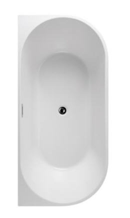 Félig szabadon álló, magasfényű fehér akril kettős falú kád, beépített túlfolyóval és click-clack lefolyóval.