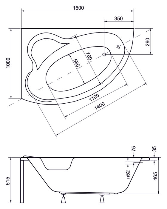 Cersanit Kaliope 153x100 cm-es aszimmetrikus kád kádlábbal, jobbos S301-025