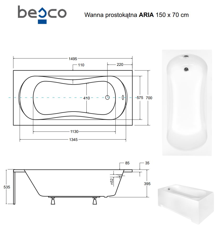 Besco ARIA 150x70 cm egyenes kád, fehér WAA-150-PABesco