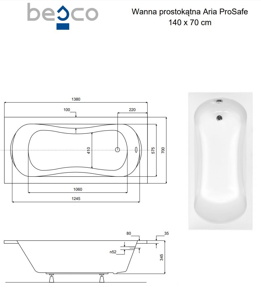Besco ARIA PROSAFE 140x70 cm alacsony egyenes kád, fehér WAA-140-PS | SzaniterPlaza.hu - Szaniter webáruház, fürdőszoba felszerelés, csaptelepek, mosdók, zuhanyok, akciós árak.