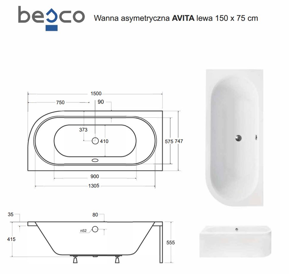 Besco AVITA 150x75 cm balos aszimmetrikus kád, fehér WAV-150-NLBesco
