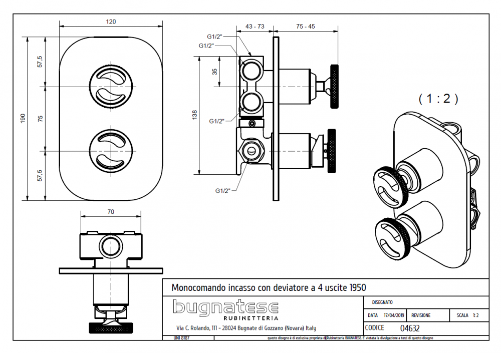 Bugnatese MILLENOVECINQUANTA fal alatti 4 állású zuhanyváltó, króm 4632CR