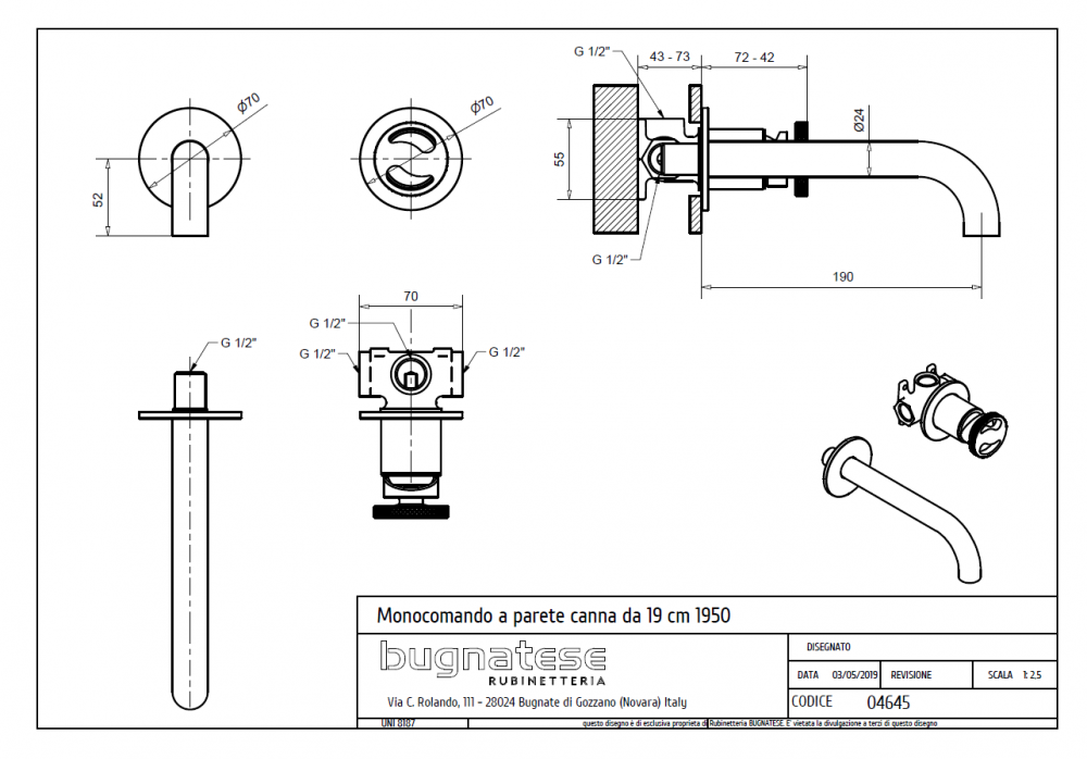 Bugnatese MILLENOVECINQUANTA fal alatti mosdócsaptelep 19 cm kifolyóval, klikk-klakk leeresztővel, szálcsiszolt nikkel 4645SCNSBugnatese