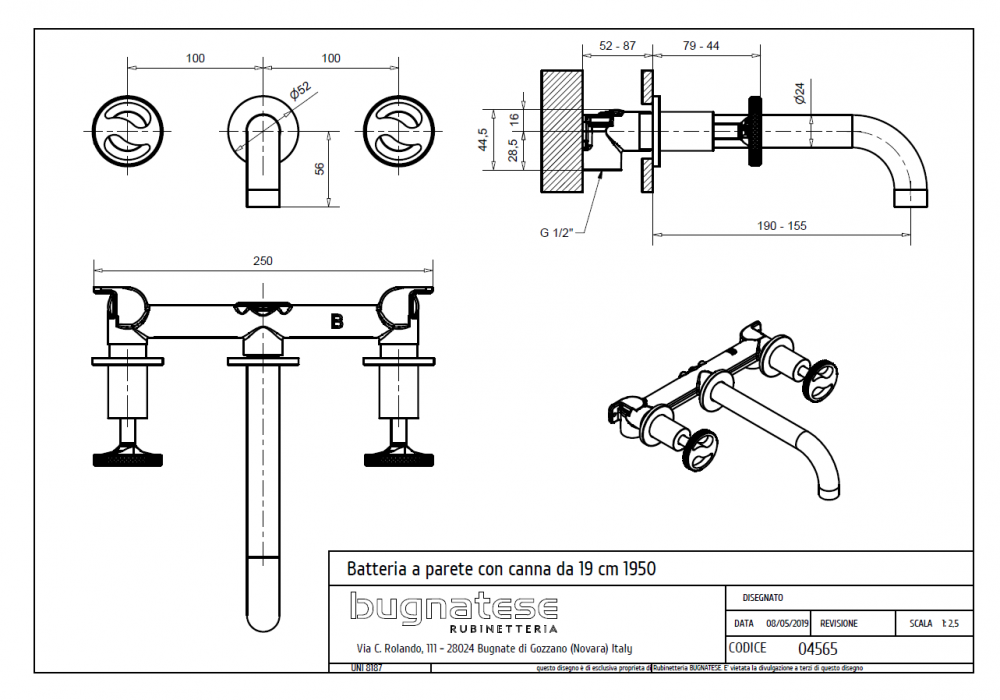 Bugnatese MILLENOVECINQUANTA fal alatti mosdócsaptelep 19 cm kifolyóval, króm 4565CRBugnatese