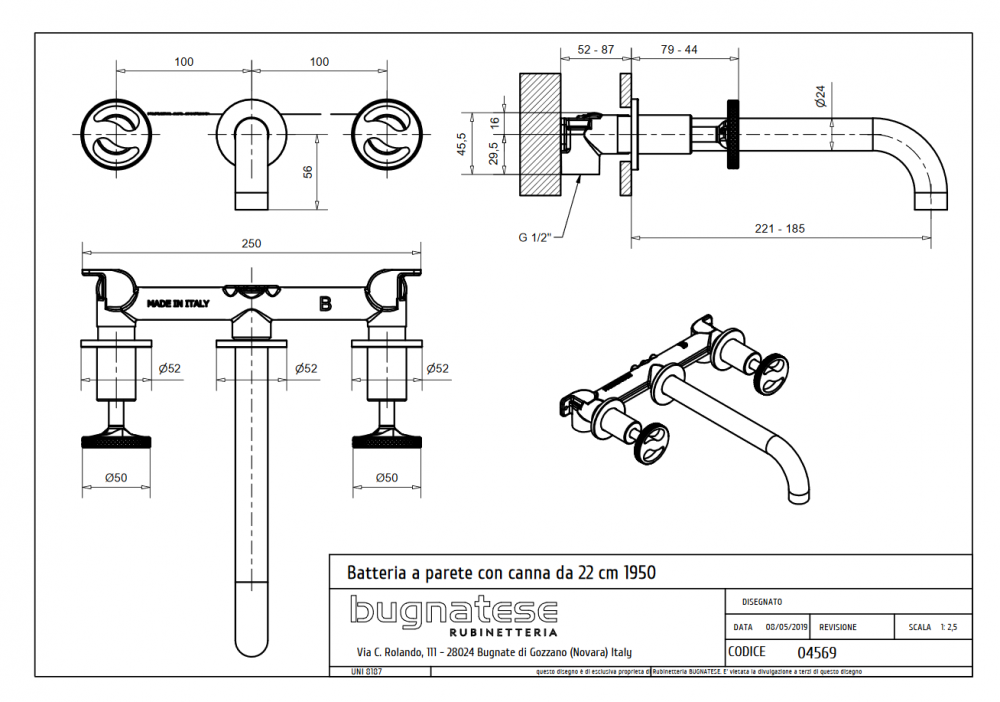 Bugnatese MILLENOVECINQUANTA fal alatti mosdócsaptelep 22 cm kifolyóval, króm 4569CR