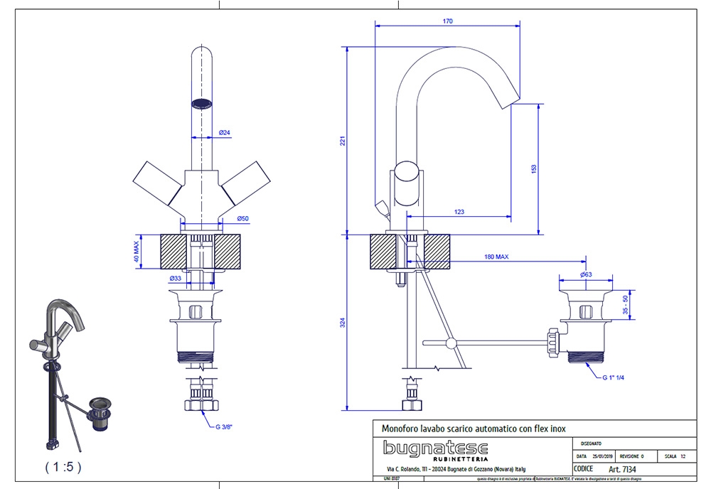 Bugnatese MOON mosdó csaptelep leeresztővel szálcsiszolt nikkel szín 7134NS