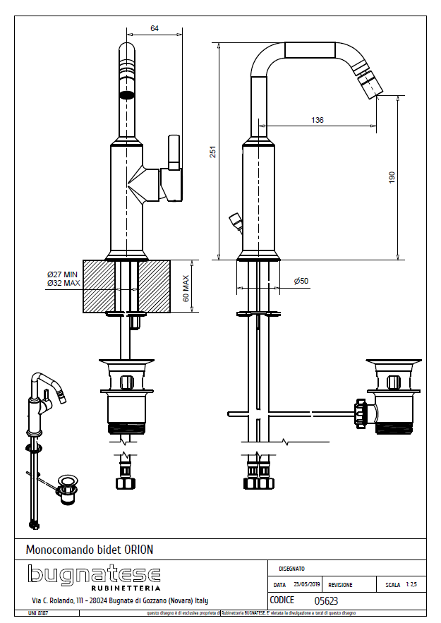Bugnatese ORION bide csaptelep leeresztővel, szálcsiszolt nikkel 5623NSBugnatese
