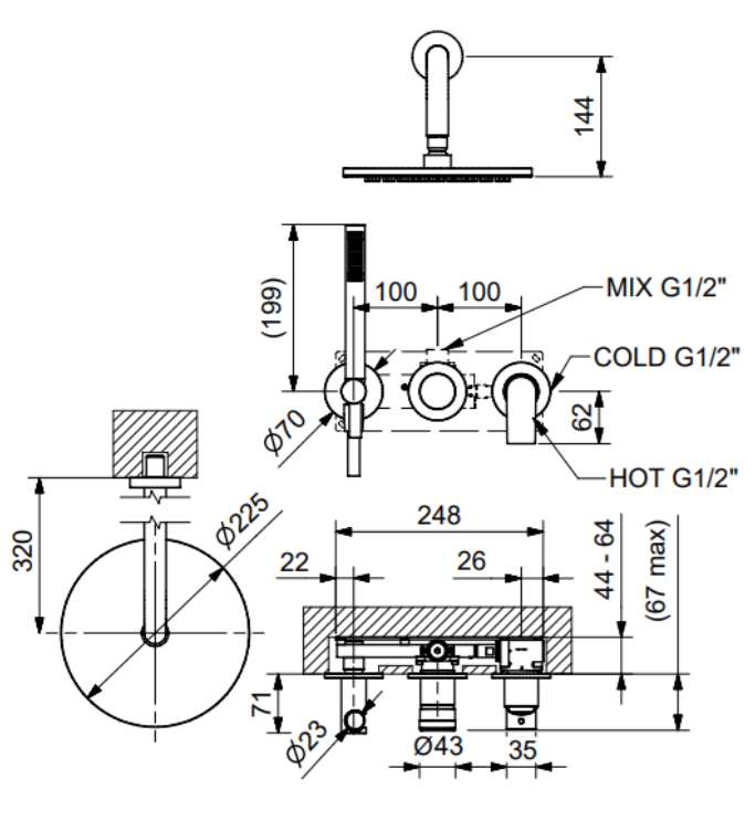 Bugnatese SIMPLE Fal alatti zuhanycsaptelep kézizuhannyal és esőztetőfejjel szálcsiszolt nikkel színben 6601HNS