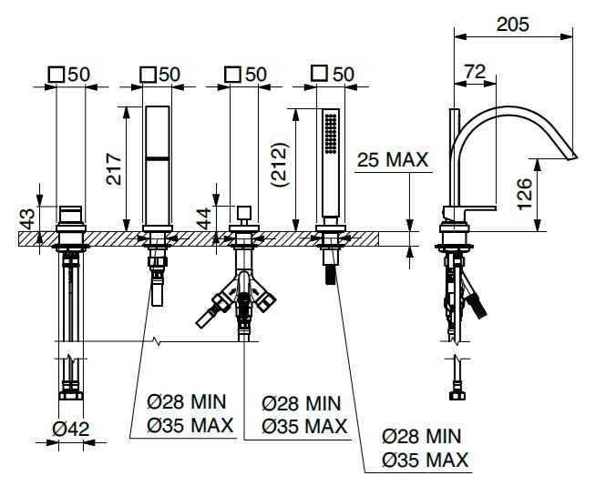 Sapho ANTEA bronz kádperemre szerelhető csaptelep, öt részes (3316)