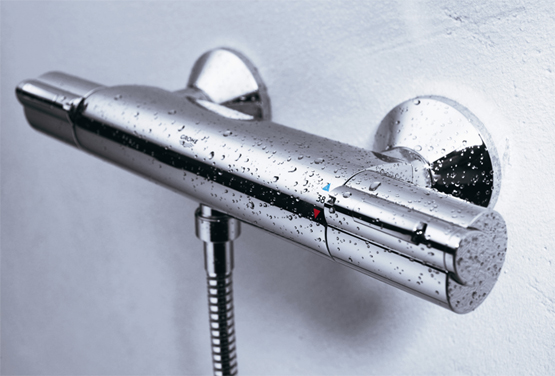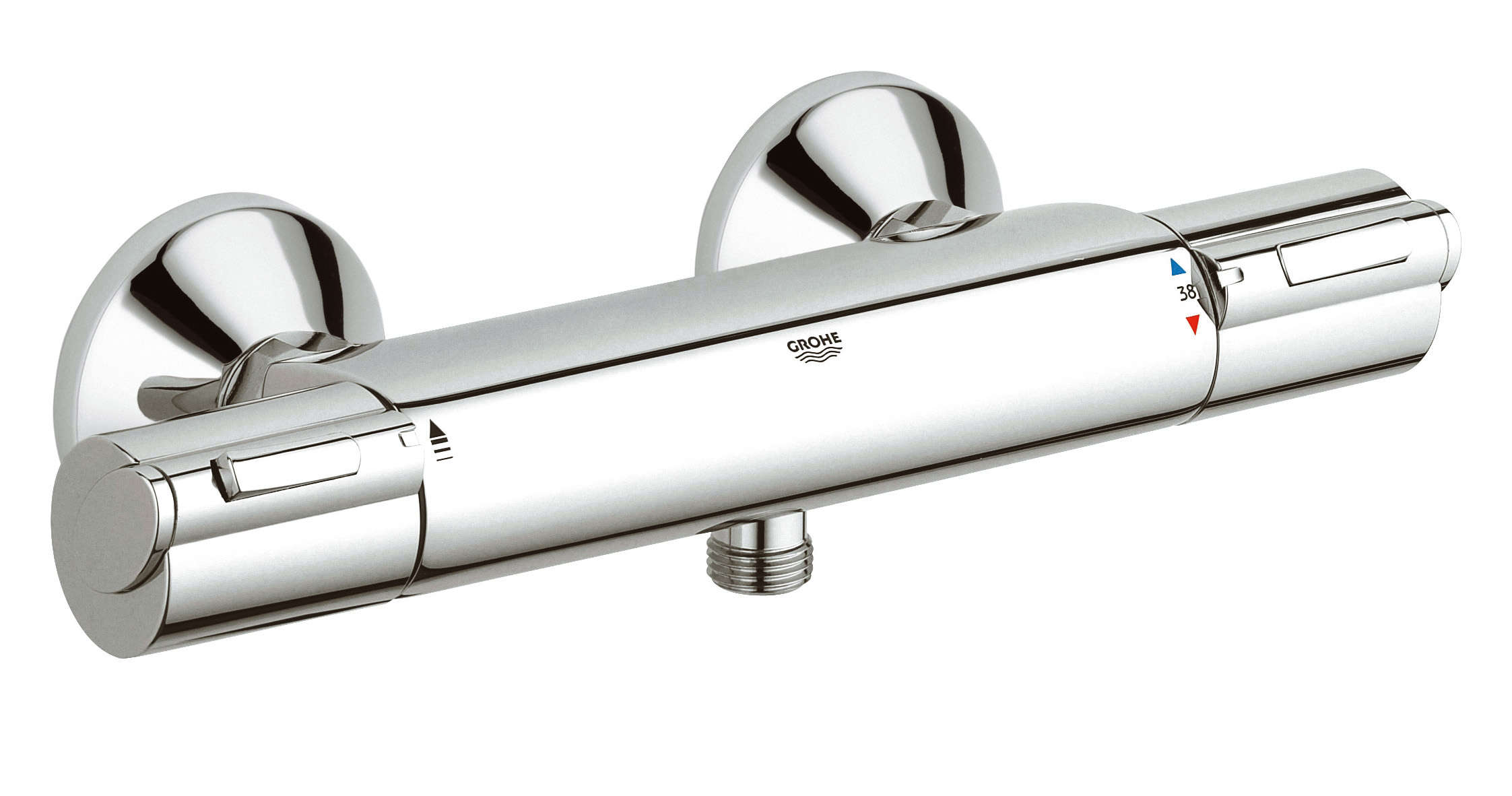 Grohe Grohtherm 1000 Termosztátos zuhanycsaptelep 34143 000 (34143000) Akciós ár a készlet erejéig!!! fali kivitel GROHE TurboStat® tágulótestes termoelemmel Carbodur belsőrész, 1/2", 180° GROHE EcoButton mennyiségszabályzó fogantyú takarékgombbal és tetszőlegesen beállítható mennyiség-korlátozóval GROHE SafeStop fogantyú 38°C-nál biztonsági retesszel 1/2"-os zuhanykimenet lent beépített visszafolyásgátlóval beépített szennyfogó szűrővel rejtett S-csatlakozókkal GROHE StarLight® króm felülettel