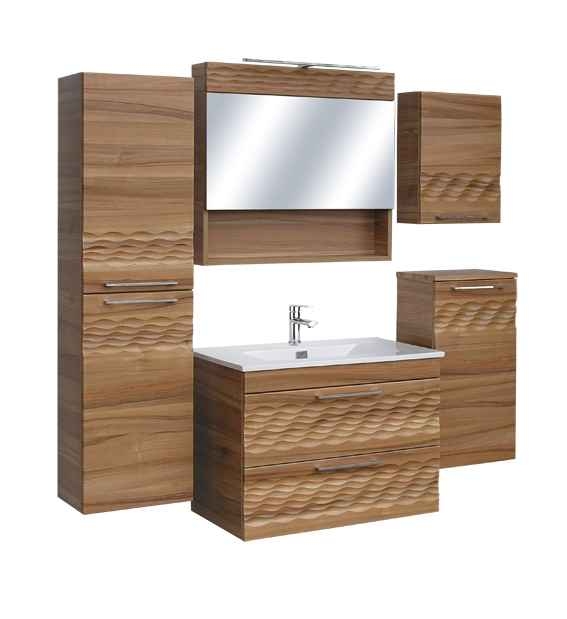 Guido Prémium Rocco fürdőszoba szekrény és kiegészítő bútorai 01. Felső tükör, led világítással 02. Fürdőszoba szekrény mosdóval 03. Hosszú fali szekrény 04. Kicsi fali felső szekrény 05. Kicsi fali alsó szekrény Megadott méretek: szélesség x magasság x mélység Kiváló tartósság Energiatakarékos led világítás Fékezőmechanikás fiókok MDF front marásmintával /marásminta nélkül is rendelhető Kosaras polc