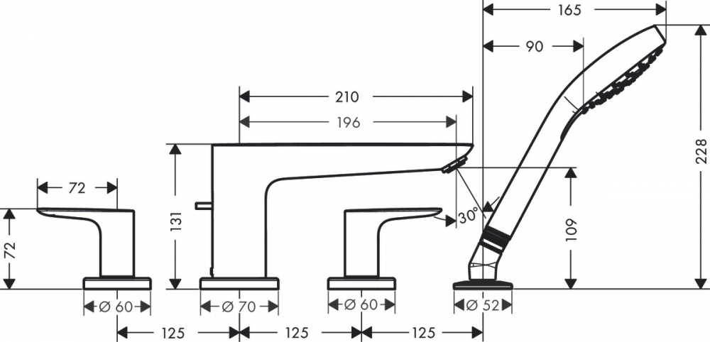 tartalmazza a következőket: 4-lyukú peremre szerelhető kádcsaptelep, kézizuhany, zuhanycső