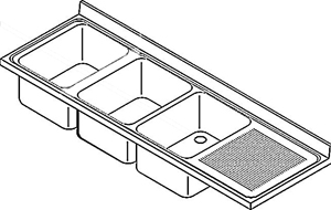 IPA három medencés mosogatófedlap csepegtetővel Mélyhúzással gyártott medence, vízvetőperem és csepegtető borda Matt medence és Scotch Brite asztal felület 100 mm magas és 15 mm vastag hátsó fali felhajtás 40 mm magas elülső és oldalsó lehajtás 70/54-es, 6/4˝-os lefolyó Anyag: rozsdamentes acél (KO33) Származási hely: Olaszország Rendelhető lábazat: 4 láb + összekötő + alsópolc + takaróköpeny 3 oldalon + összekötő