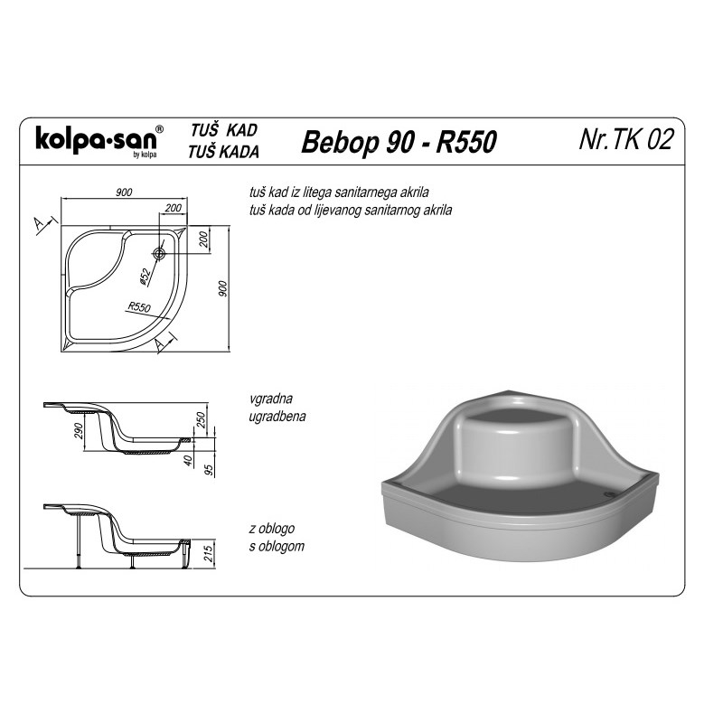 Kolpa-San Bebop 90x90 negyedköríves zuhanytálca ülőkével 790060Kolpa-San