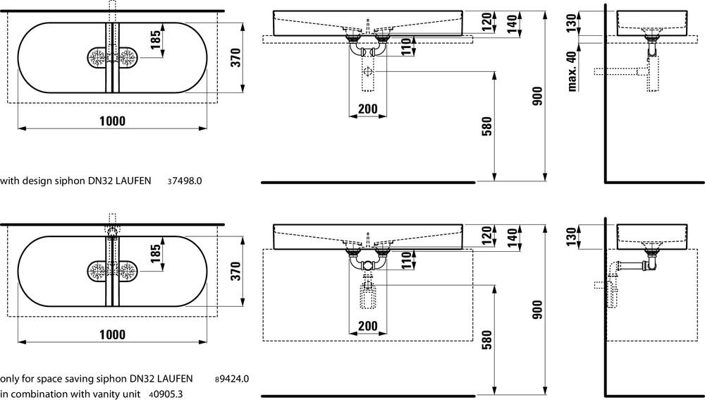 Laufen Sonar 100x37 cm pultra ültethető dupla mosdó H8123480001121