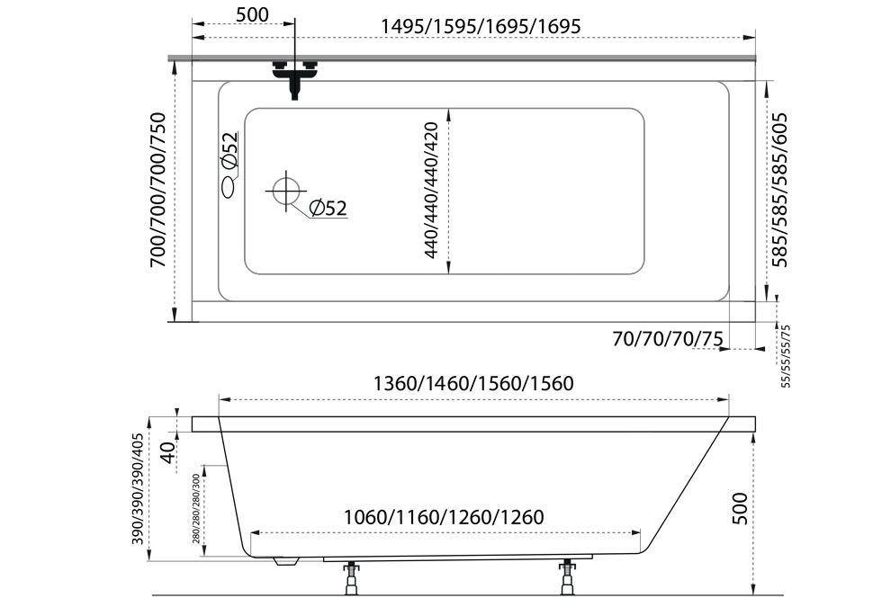 M-Acryl Eco 150x70 egyenes kád kádlábbal (12380)M-Acryl