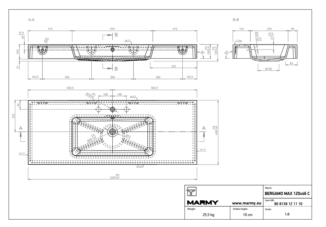Marmy BERGAMO MAX C 120x46 cm mosdó, fehér 80 8138 12 11 10Marmy
