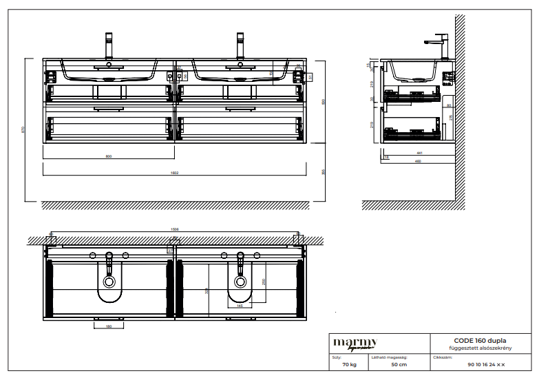Marmy CODE 160x46x50 DUPLA függesztett alsószekrény, 4 fiók, laminált (mosdó nélkül) Brown Oak 20 40 24 16 00 86Marmy