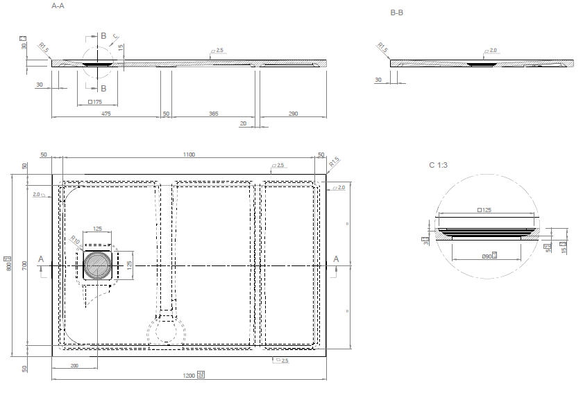 Marmy Dolomite öntött márvány zuhanytálca 90x140 cm, matt szürke 80 7853 90 14 53
