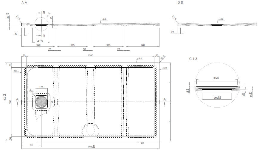 Marmy Dolomite öntött márvány zuhanytálca 90x140 cm, matt szürke 80 7853 90 14 53
