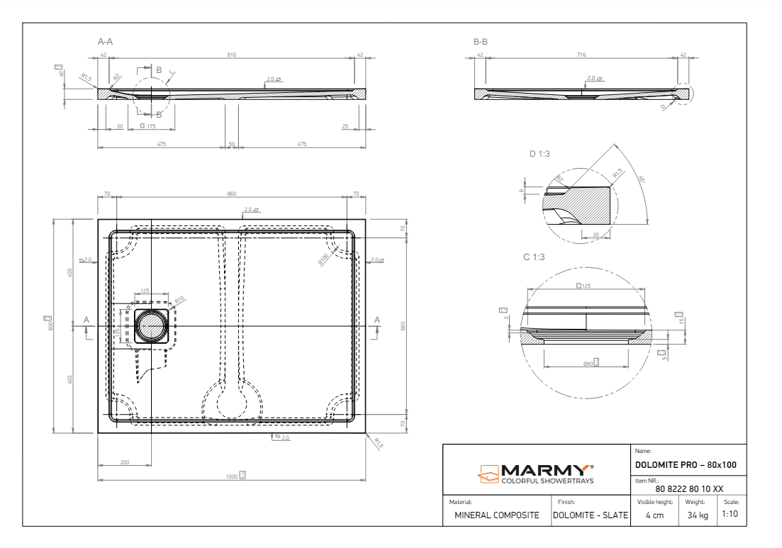 A MARMY DOLOMITE PRO zuhanytálcája - a DOLOMITE sorozat PEREMES változata - kombinálja az elegáns ROZSDAMENTES összefolyót, a professzionális GEBERIT szifonnal és a könnyen beépíthető alaptálcával. Extra vékony mindössze 4 cm, felülete matt kőhatású, csúszásgátlós, masszív és szuper strapabíró ÚJ GENERÁCIÓS öntött márvány zuhanytálca. A zuhanytálca háromféle módon is beépíthető, padlóra helyezve, félig süllyesztve, süllyesztve.