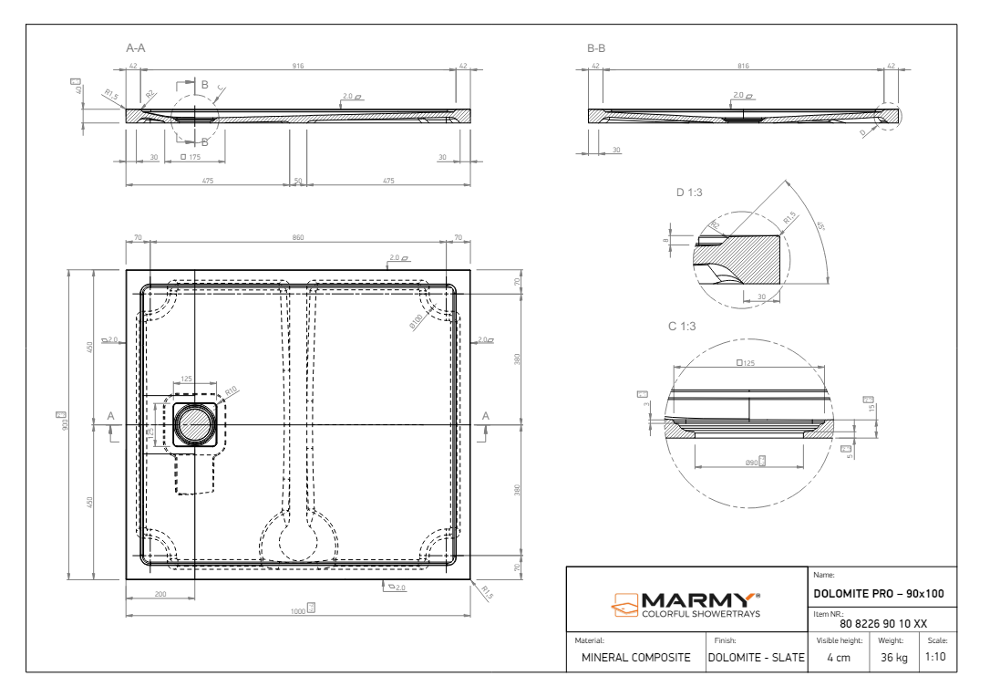 A MARMY DOLOMITE PRO zuhanytálcája - a DOLOMITE sorozat PEREMES változata - kombinálja az elegáns ROZSDAMENTES összefolyót, a professzionális GEBERIT szifonnal és a könnyen beépíthető alaptálcával. Extra vékony mindössze 4 cm, felülete matt kőhatású, csúszásgátlós, masszív és szuper strapabíró ÚJ GENERÁCIÓS öntött márvány zuhanytálca. A zuhanytálca háromféle módon is beépíthető, padlóra helyezve, félig süllyesztve, süllyesztve.