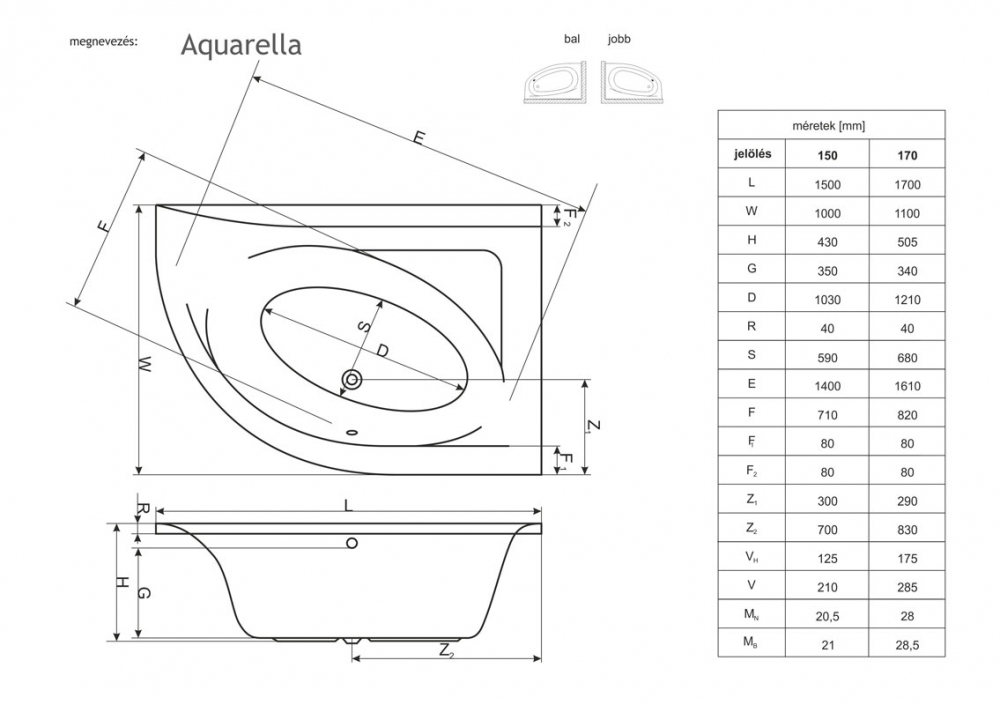 Niwell AQUARELLA 150x100 cm aszimmetrikus kád, jobbos WANW.ARP.150.100.WH