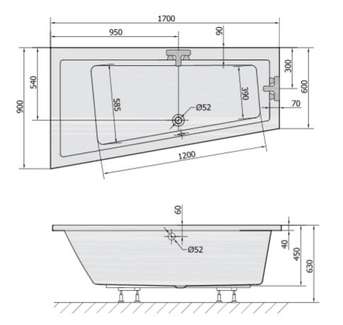 Polysan ANDRA L 170x90x45cm-es aszimmetrikus kád, balos (81111)