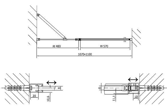 Telepítési méret (két fal között): 1085 ±15 mm, oldalfallal 1080 ±10 mm