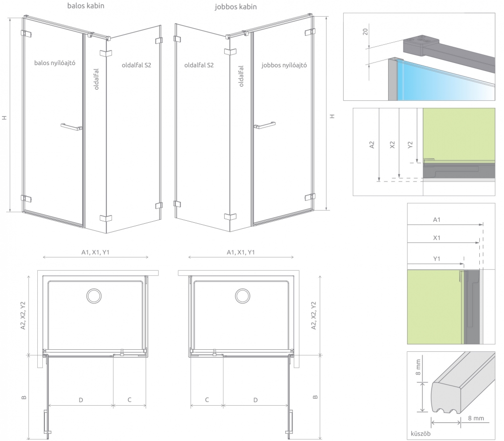 A zuhanyajtót önállóan nem lehet használni. Oldalfallal kombinálva különböző méretű zuhanykabin alakítható ki.