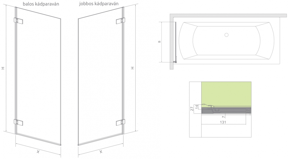 A kádparaván belső üvegfelületével teljesen sík króm zsanérok a könnyű takaríthatóság érdekében.