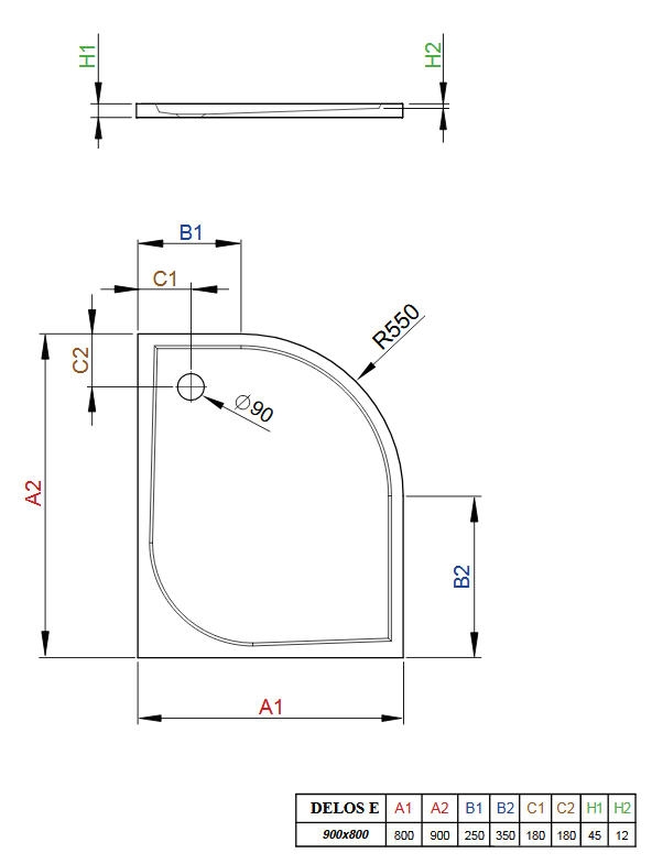 Radaway Delos E 90x80 cm aszimmetrikus zuhanytálca