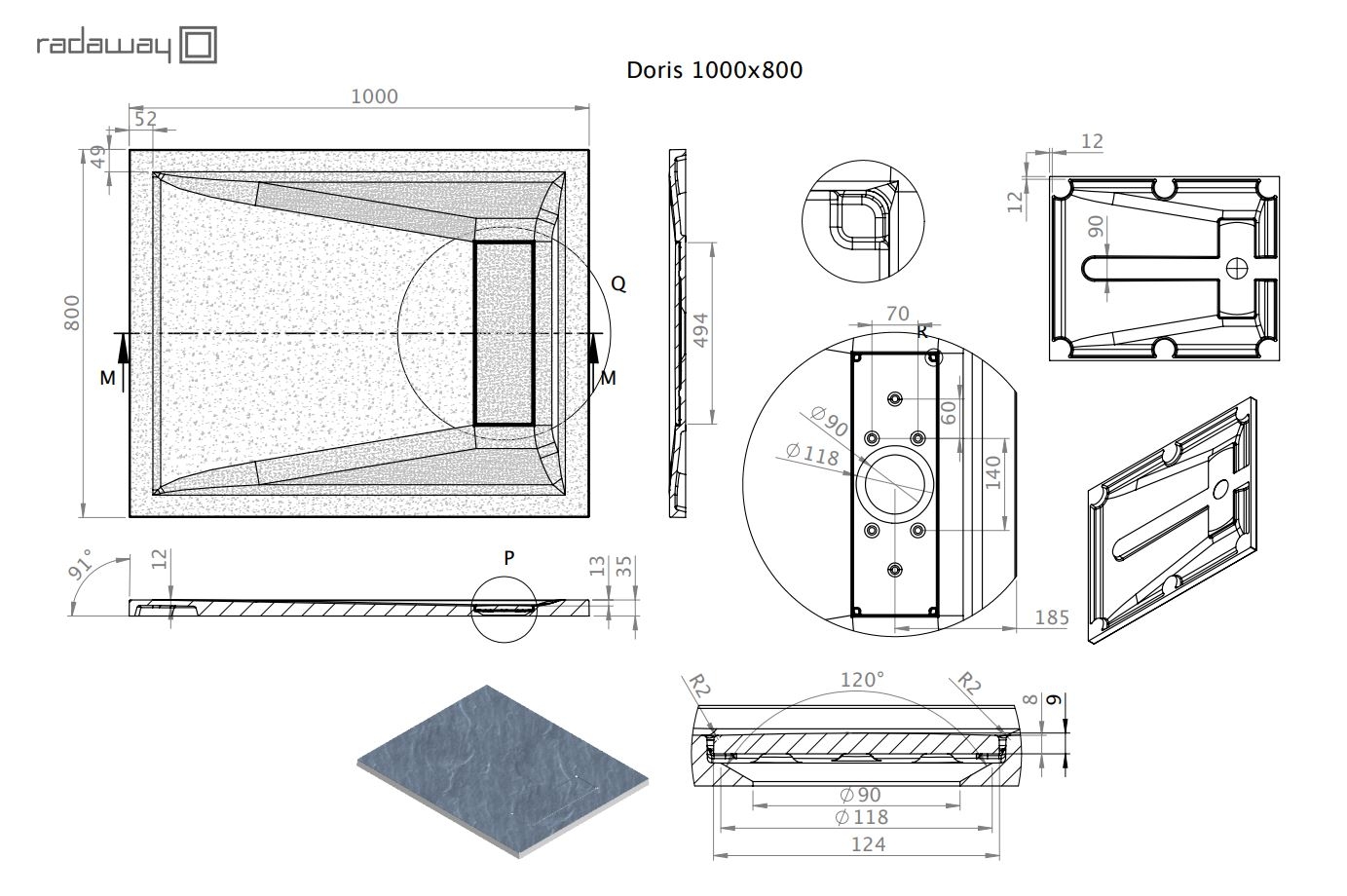 Szögletes, aszimmetrikus műmárvány zuhanytálca, mely közvetlenül a padlósíkra építhető vagy padlósíkba süllyeszthető.