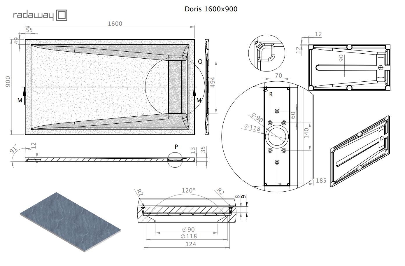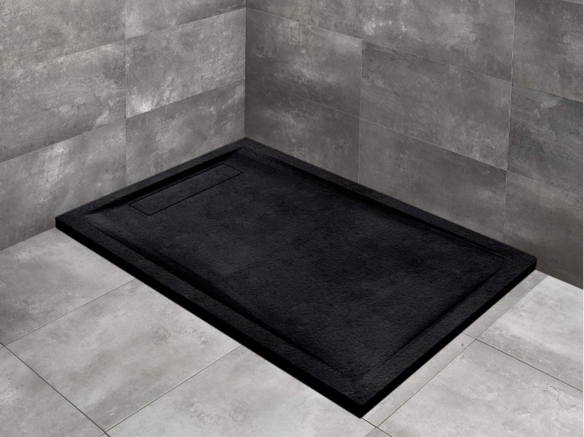 Szögletes, aszimmetrikus műmárvány zuhanytálca, mely közvetlenül a padlósíkra építhető vagy padlósíkba süllyeszthető.