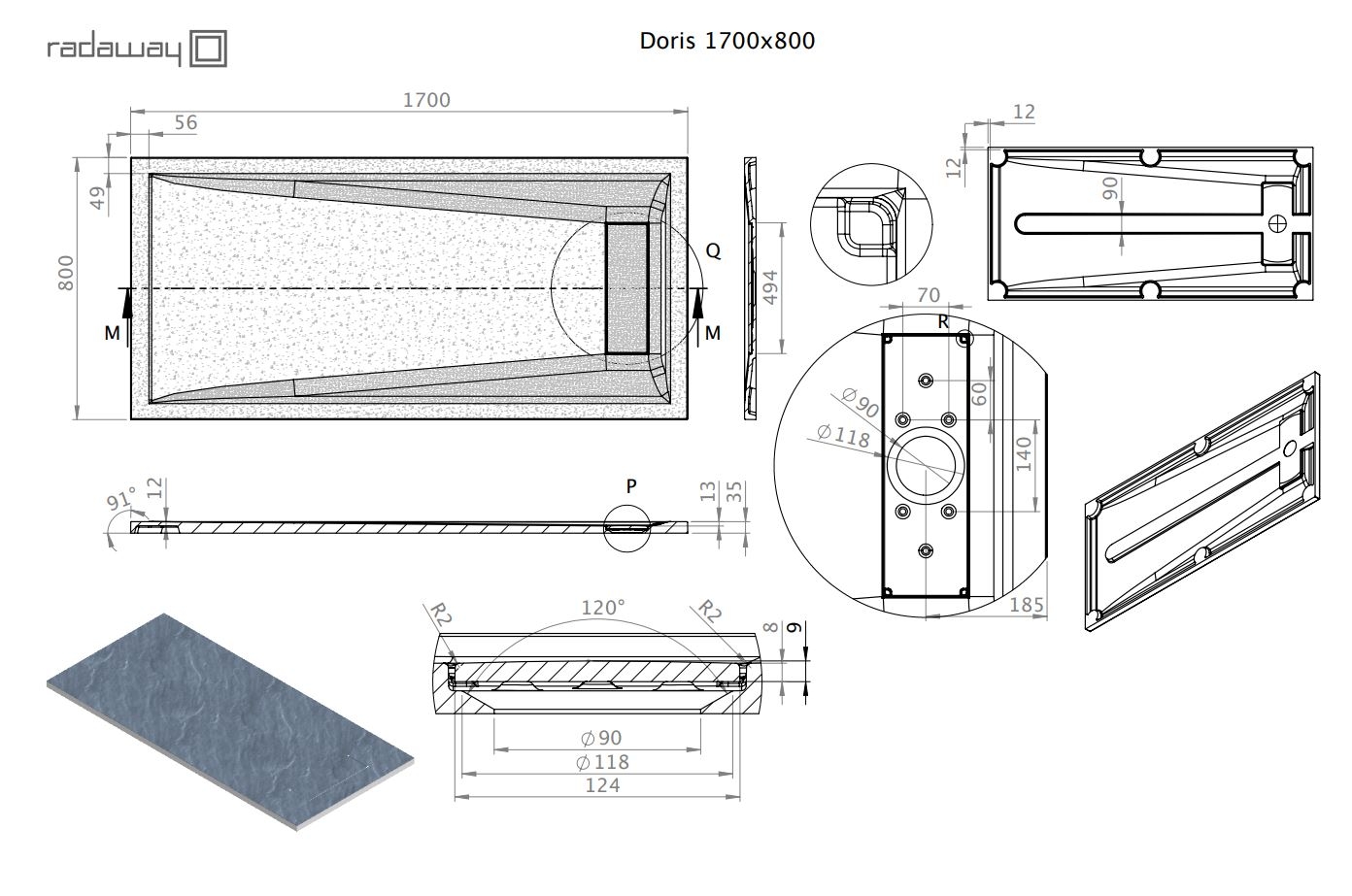 Szögletes, aszimmetrikus műmárvány zuhanytálca, mely közvetlenül a padlósíkra építhető vagy padlósíkba süllyeszthető.