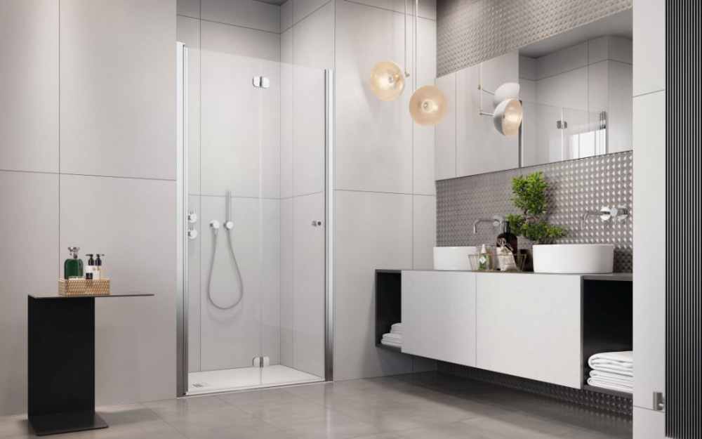 Különleges zuhanyajtó dupla csuklós lengőajtóval.