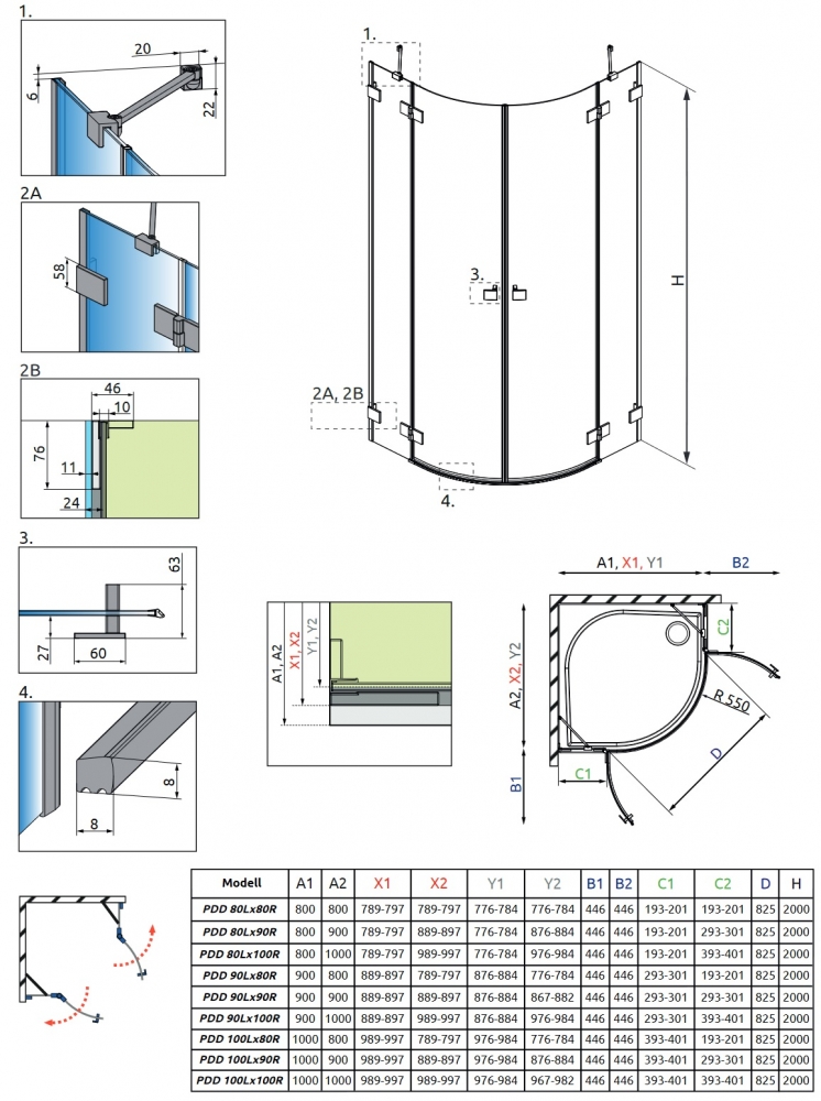 (Példa: 1 db PDD 80B + 1 db PDD 80J = 80x80-as zuhanykabin)