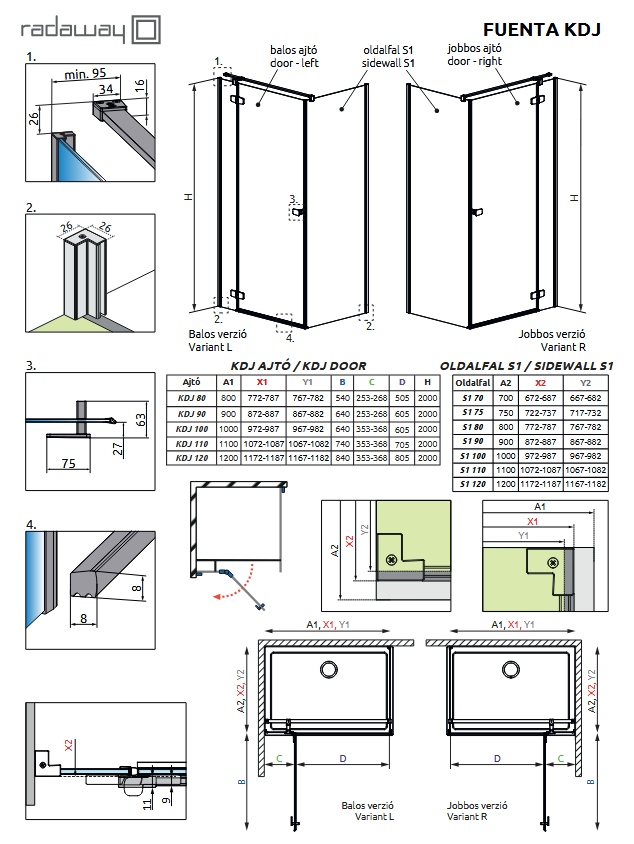 A Fuenta KDJ zuhanykabin 2 elemből áll: ajtó és oldalfal. A zuhanykabin rendelésekor 2 termékkódot kell megadni. (Példa: 1 db KDJ 80B + 1 db S1 80 = 80x80 balos zuhanykabin)