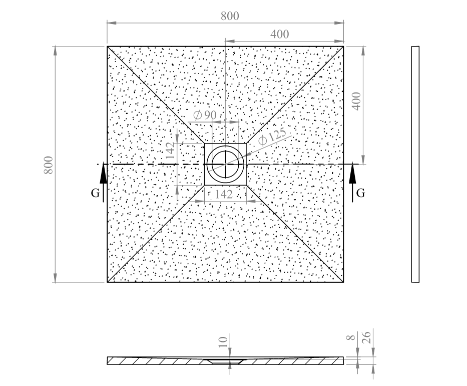 Szögletes, műmárvány zuhanytálca, közvetlenül a padlósíkra építhető.