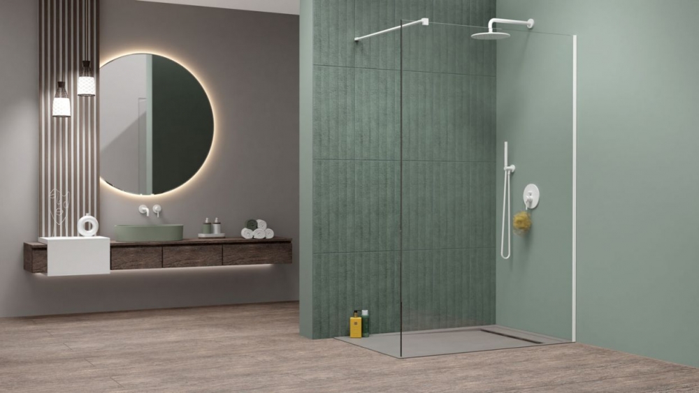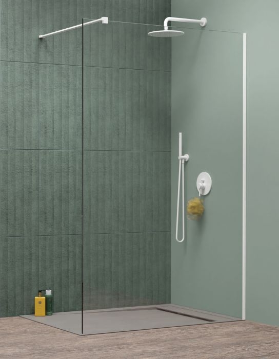 Fali profillal a falra szerelhető fehér pengefal 8 mm-es Easy Clean edzett üvegből.