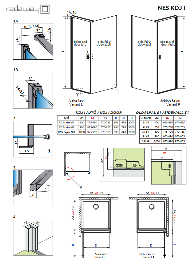A Nes KDJ I zuhanykabin 2 elemből áll: ajtó és oldalfal. Mindkét elemnek saját termékkódja van. A kabin rendelésekor 2 termékkódot kell megadni. (Példa: 1 db KDJ I 90B + 1 db S1 90 = 90x90-es balos zuhanykabin)