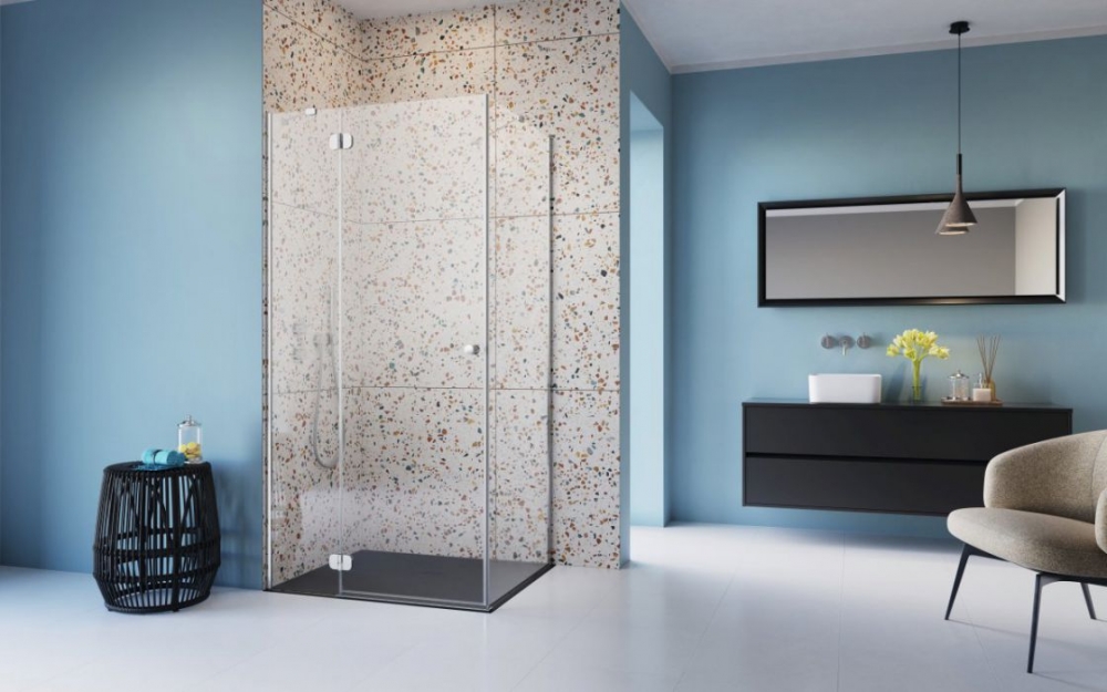 Kifelé nyíló szögletes zuhanykabin egy ajtóval és egy fix oldalfallal.