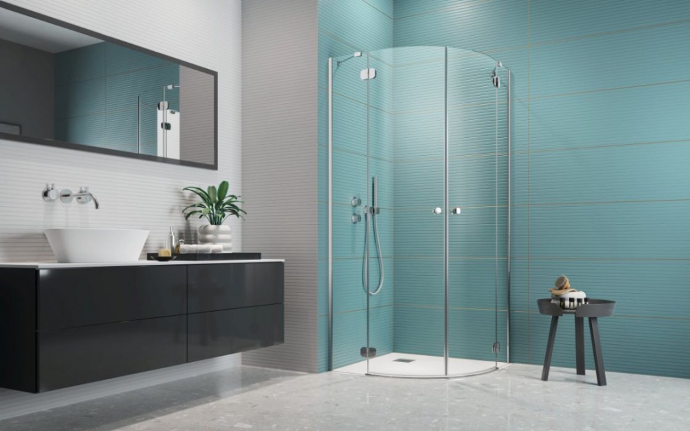 Kifelé nyíló íves zuhanykabin dupla ajtókkal és fix résszel.