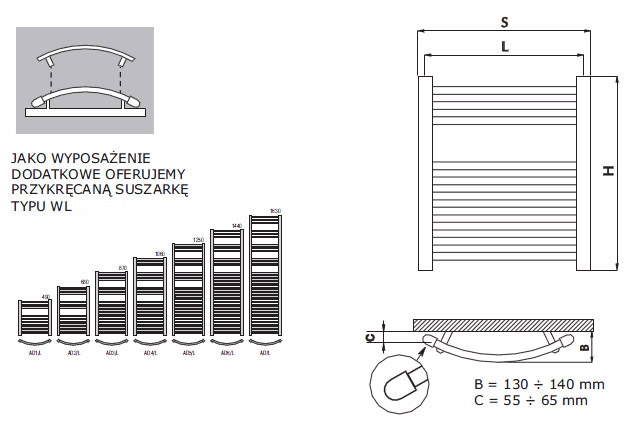Radeco Adamo AD6-500/L D profilos íves törölközőszárítós csőradiátor (960 W, fehér, 1440x550 mm)