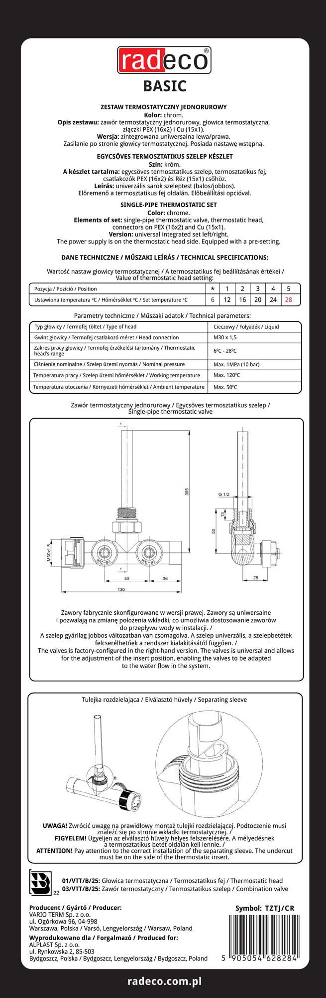 A készlet tartalma: termosztatikus szeleptest 2 csöves fűtéshez, termosztatikus fej, csatlakozók PEX (16x2) és Réz (15x1) csőhöz.
