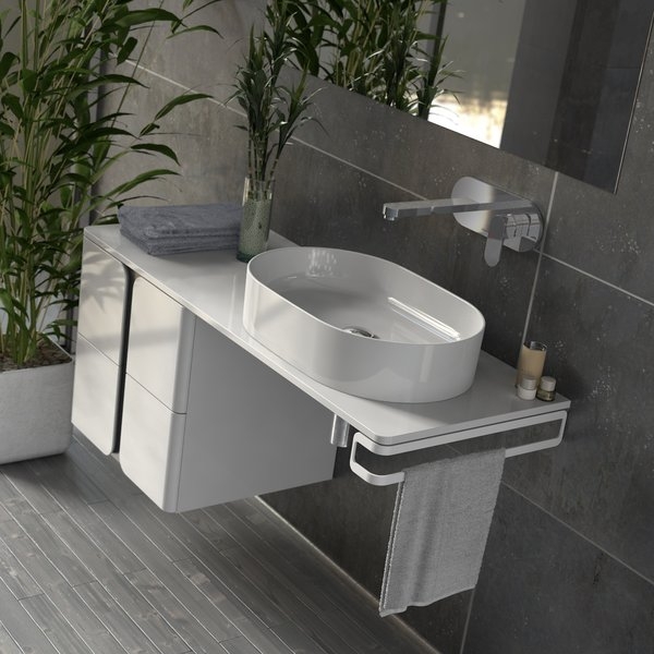 Amennyiben a mosdópult egy falra helyezhető szekrényre van ráhelyezve az egyik oldalán, a másik oldalát alá kell támasztani Balance/Comfort 1200 lap tartóval. A mosdópult alá szerelhető egy fehér Balance törölközőtartó.